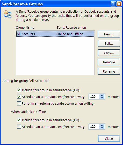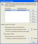 You'll probably see a single group. Select it if isn't already, then look at the settings in the bottom part of the dialog box. Adjust the automatic send/receive schedule options to the longest time you dare. Click Close, then OK to get back. Incoming messages will interrupt you far less frequently, and you should get far more done.